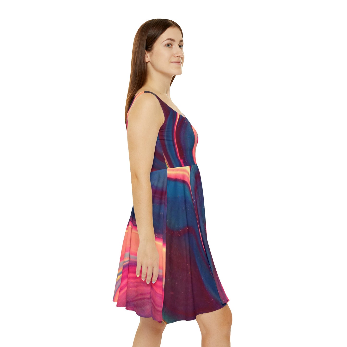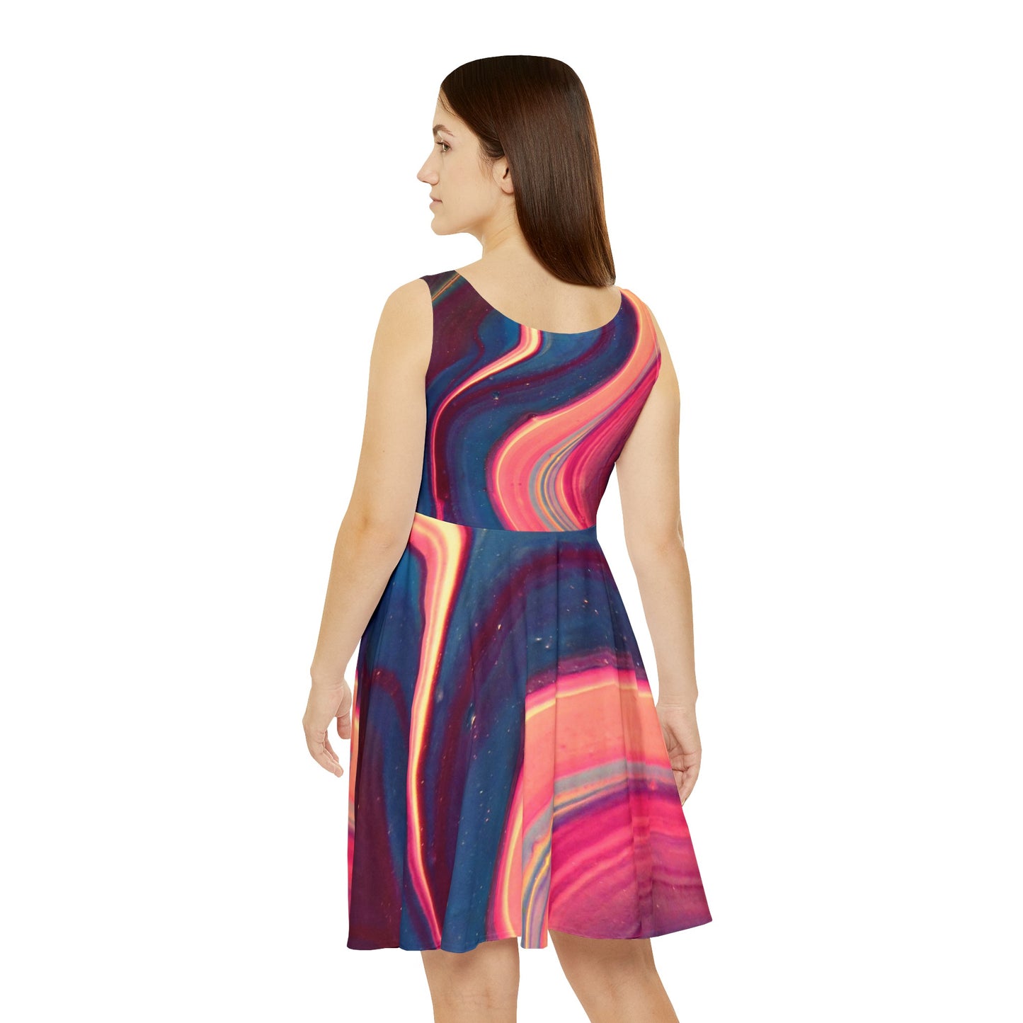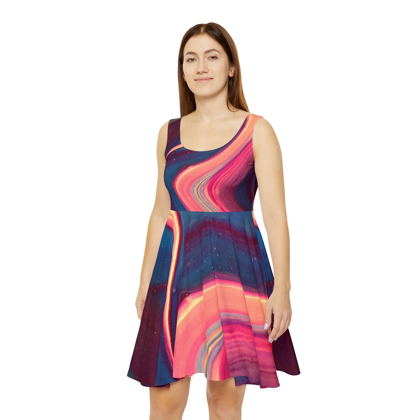 Whether it's hitting the town or lounging around, this wave skater dress brings an unmatched flair to any woman's wardrobe. Made with a high-quality, 290gsm fabric blend that is 83% polyester, 17% spandex, it's comfy, stretchy and a perfect match to any occasion. This instant favorite for any day of the week.