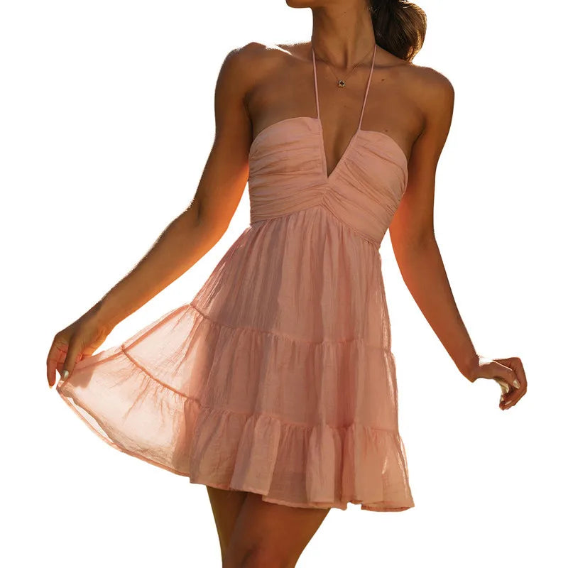Turn heads with this daring WPNAKS backless mini dress, perfect for summer evenings and club nights. Its sleeveless halter design and flowy tiered layers create a sexy, effortless silhouette that moves with you. Ideal for making a bold statement at parties or casual outings, this dress combines comfort with eye-catching style. Embrace your confidence and stand out wherever you go.